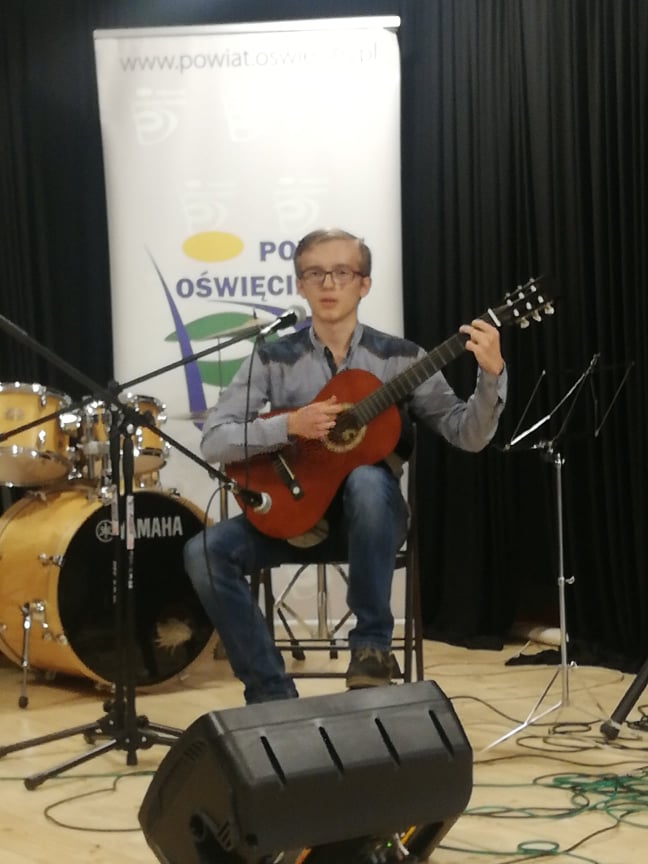 uczestnik konkursu podczas występu śpiewa i gra na gitarze