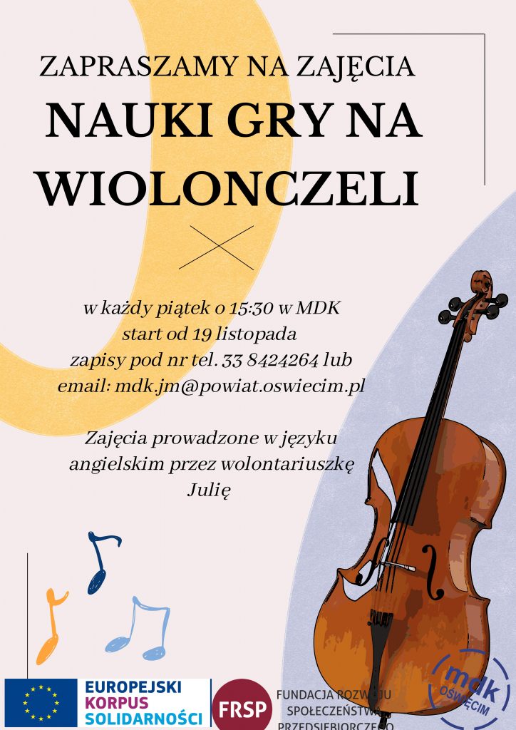 Nowe Zajęcia – Nauka gry na wiolonczeli. 3 listopada, 2021 Category: Aktualności Możliwość komentowania Nowe Zajęcia – Nauka gry na wiolonczeli. została wyłączona Post Views: 260 Serdecznie zapraszamy na nasze nowe zajęcia nauki gry na wiolonczeli, prowadzone przez wolontariuszkę z Hiszpanii Julię.