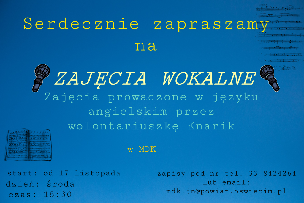 Zajęcia z wokalu w MDK 3 listopada, 2021 Category: Aktualności Możliwość komentowania Zajęcia z wokalu w MDK została wyłączona Post Views: 266 serdecznie zapraszamy do MDK na zajęcia z wokalu prowadzone przez nasza wolontariuszkę Knarik.