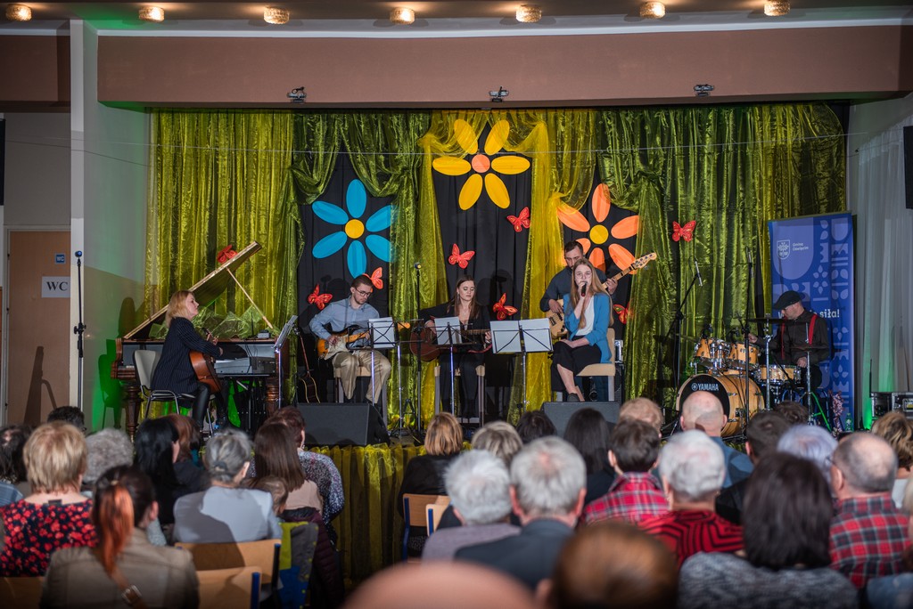 W piątek 14 kwietnia zespół naszych muzyków zagrał koncert w sali Domu Ludowego w Porębie Wielkiej. Repertuar obejmował piosenki zespołu “Pod Budą”. Wypełniona po brzegi sala włączyła się w śpiew największych przebojów Andrzeja Sikorowskiego. Zabrzmiały m.in. takie utwory jak “Piwna 7”, “Znów idziemy na całość”, “Nie przenoście nam stolicy do Krakowa” czy “Przy niedzieli zabawa”. Na scenie wystąpili:
