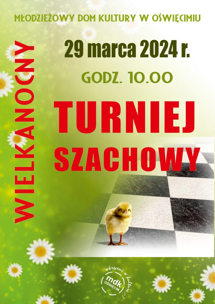 WIELKANOCNY TURNIEJ SZACHOWY 19 marca, 2024 Category: Konkursy, Aktualności Możliwość komentowania WIELKANOCNY TURNIEJ SZACHOWY została wyłączona Post Views: 469 Serdecznie zapraszamy na Wielkanocny Turniej Szachowy, który odbędzie się 29 marca w MDK o g.10.00