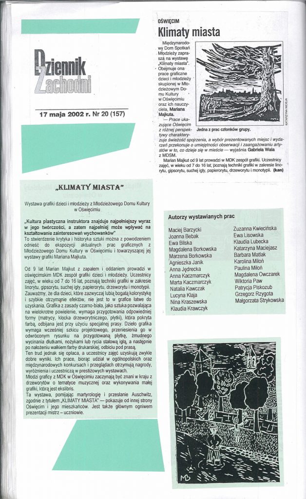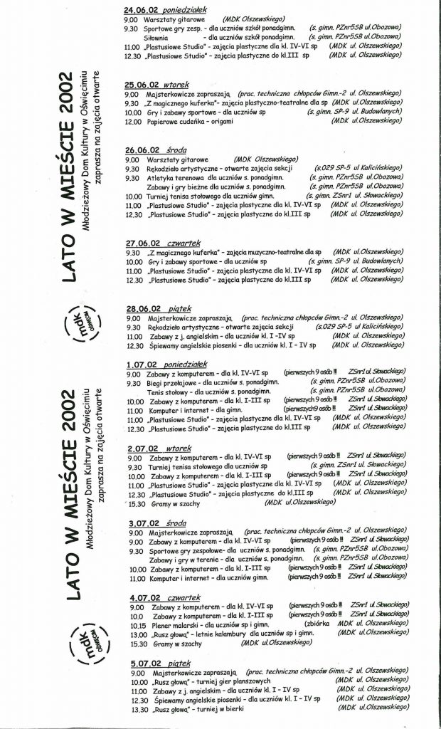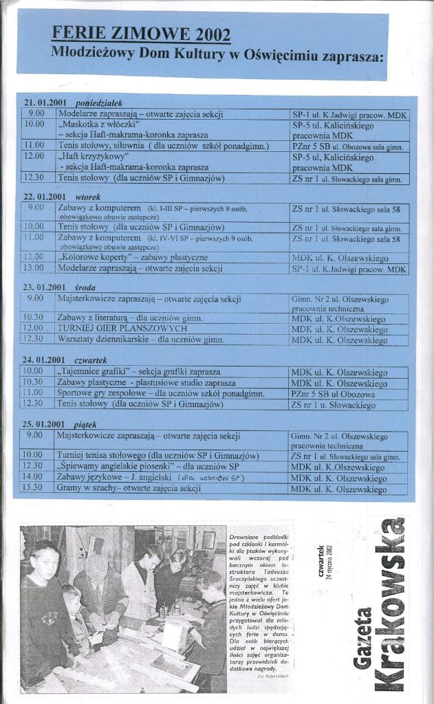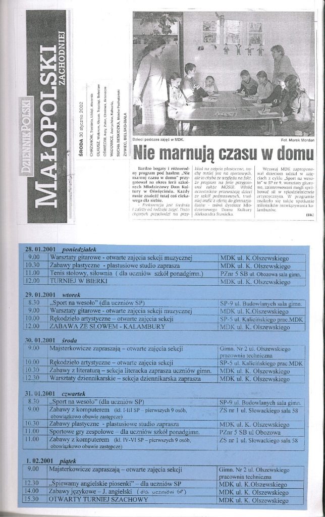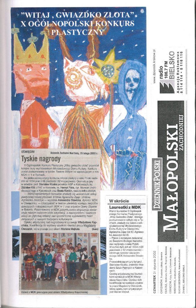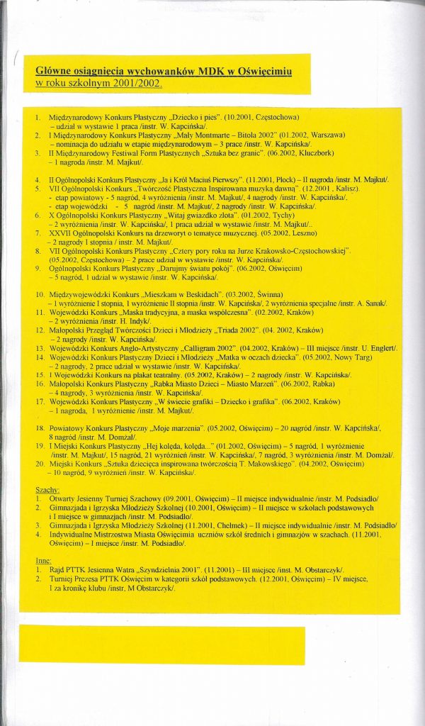 HISTORIA MDK W KRONIKACH ZAKLĘTA – cz. 27 (rok szkolny 2001/2002) 8 lipca, 2025 Category: Aktualności, Historia MDK Możliwość komentowania HISTORIA MDK W KRONIKACH ZAKLĘTA – cz. 27 (rok szkolny 2001/2002) została wyłączona Post Views: 113