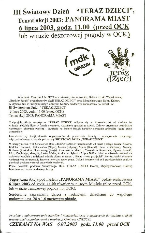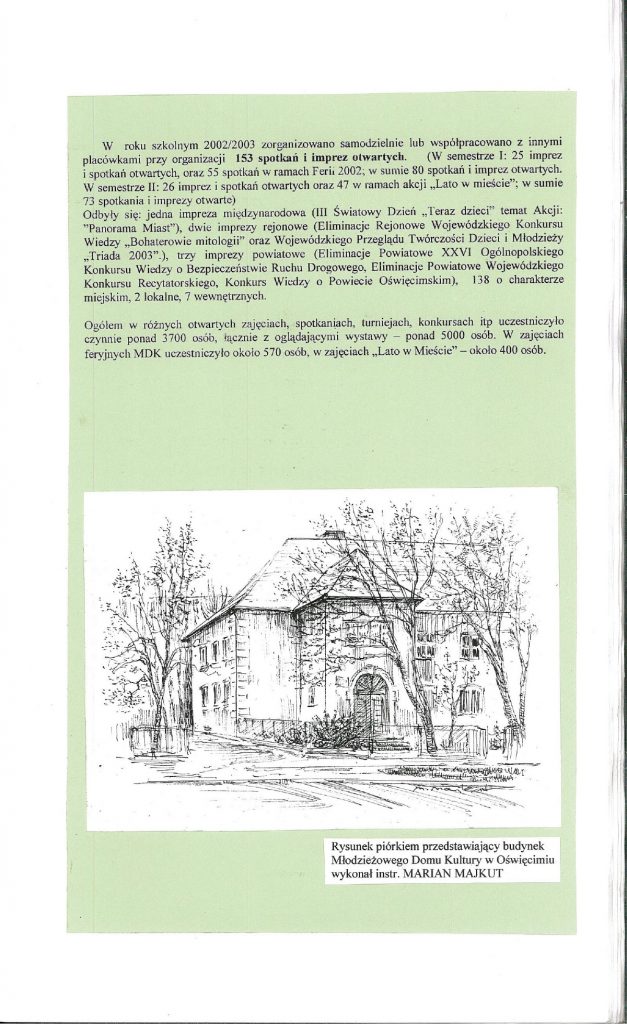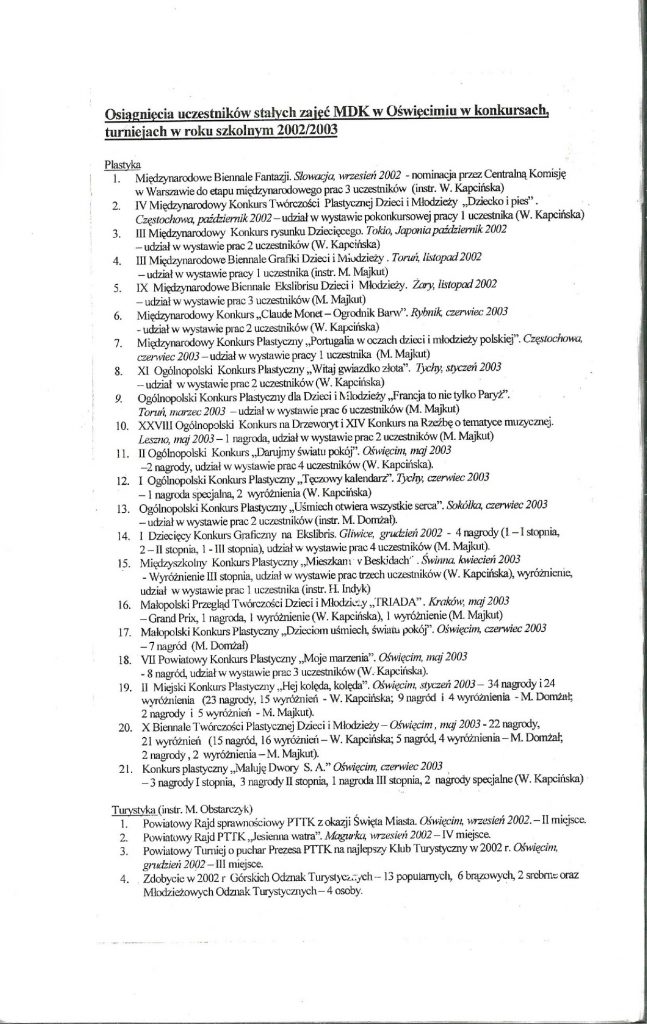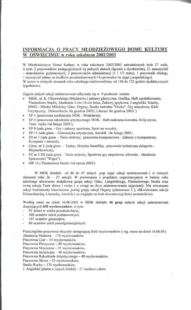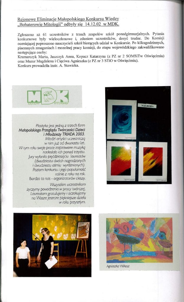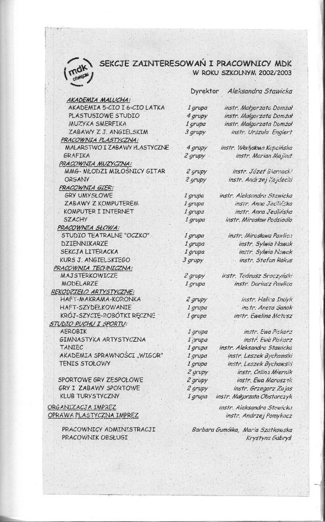 HISTORIA MDK W KRONIKACH ZAKLĘTA – cz. 28 (rok szkolny 2002/2003) 9 lipca, 2025 Category: Aktualności, Historia MDK Możliwość komentowania HISTORIA MDK W KRONIKACH ZAKLĘTA – cz. 28 (rok szkolny 2002/2003) została wyłączona Post Views: 49